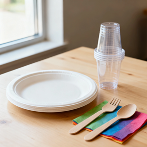カトラリー、カップ、テイクアウト容器、ストローなど多品種を展開。PLAや生分解素材を選択可能。ブランド印刷にも対応。