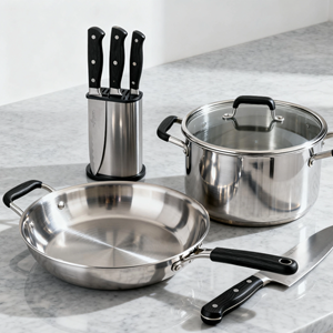 鍋、トレイ、ボウル、保存容器など、食品グレードのステンレス素材を採用。耐久性・衛生性に優れ、OEM・大量注文にも対応します。